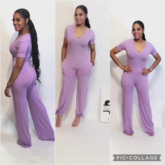 lavender jumpsuit is very stretchy, long, classy and can be dressed up or down. Perfect for tall woman and my short ladies can tie it like so.